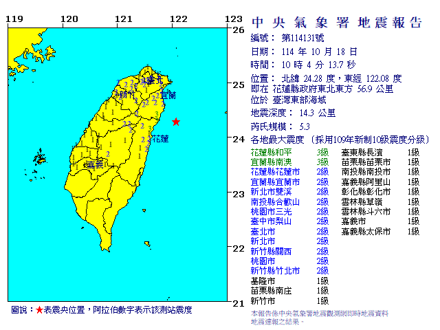 | 發 震 時 間: | 114年10月18日10時 4分13.7秒 |