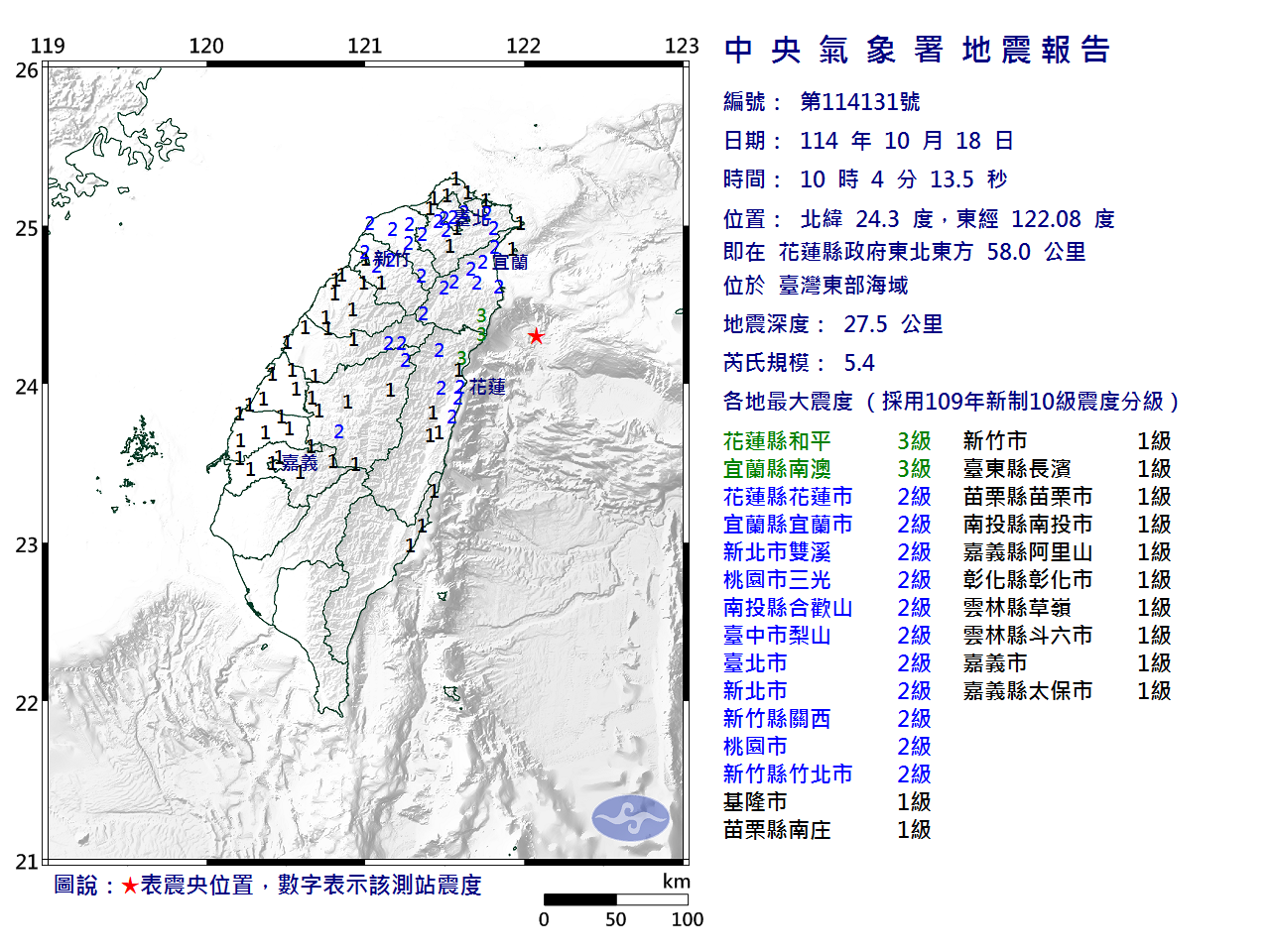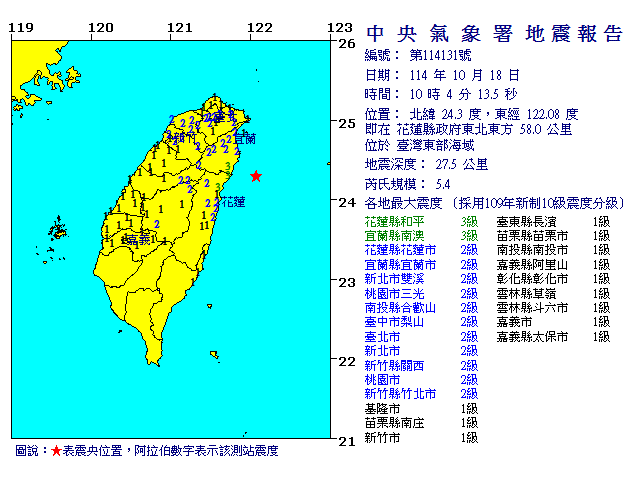 | 發 震 時 間: | 114年10月18日10時 4分13.5秒 |