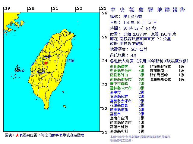 | 發 震 時 間: | 114年10月23日20時28分 6.4秒 |