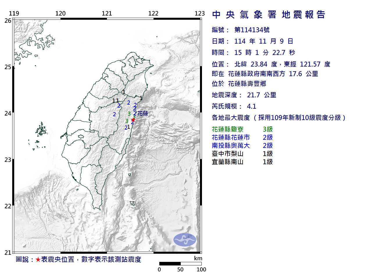 | 發 震 時 間: | 114年11月 9日15時 1分22.7秒 |
