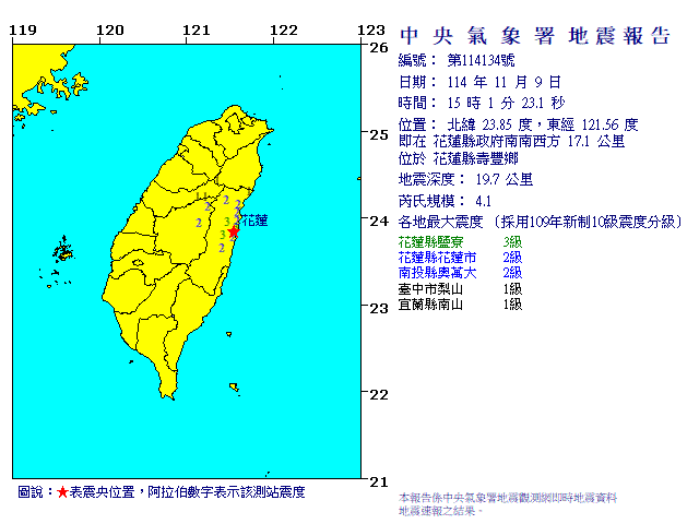 | 發 震 時 間: | 114年11月 9日15時 1分23.1秒 |