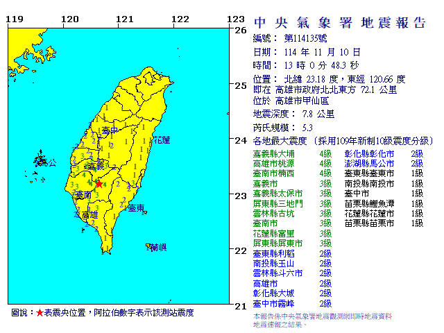| 嘉義縣地區最大震度 4級 | 高雄市地區最大震度 4級 | 臺南市地區最大震度 4級 |