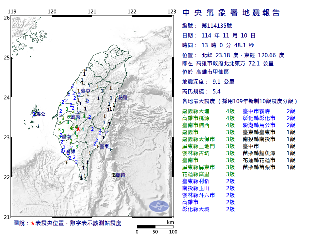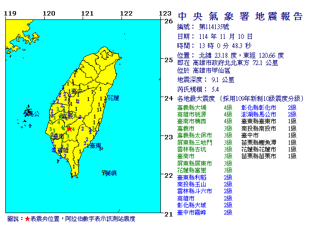 | 發 震 時 間: | 114年11月10日13時 0分48.3秒 |
