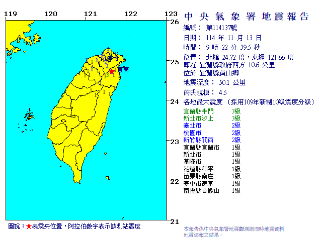 | 發 震 時 間: | 114年11月13日 9時22分39.5秒 |