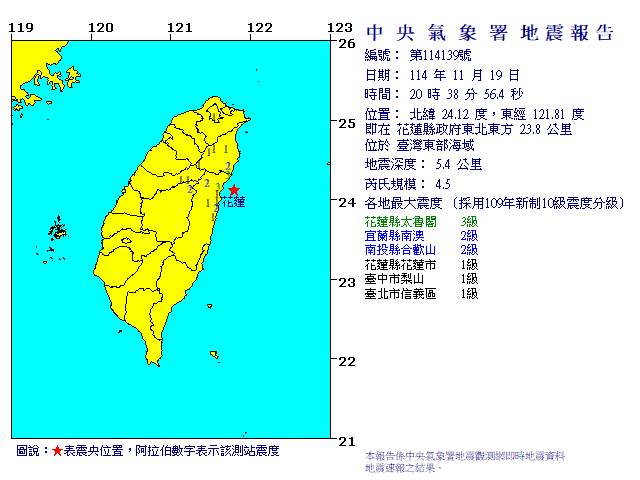 | 發 震 時 間: | 114年11月19日20時38分56.4秒 |