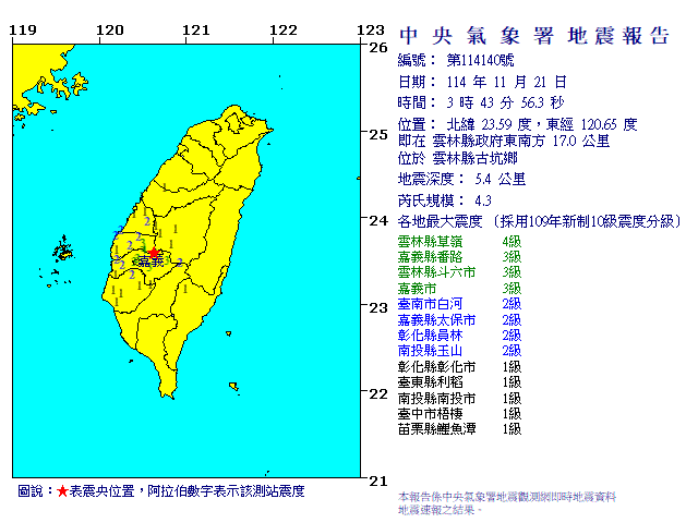 | 發 震 時 間: | 114年11月21日 3時43分56.3秒 |