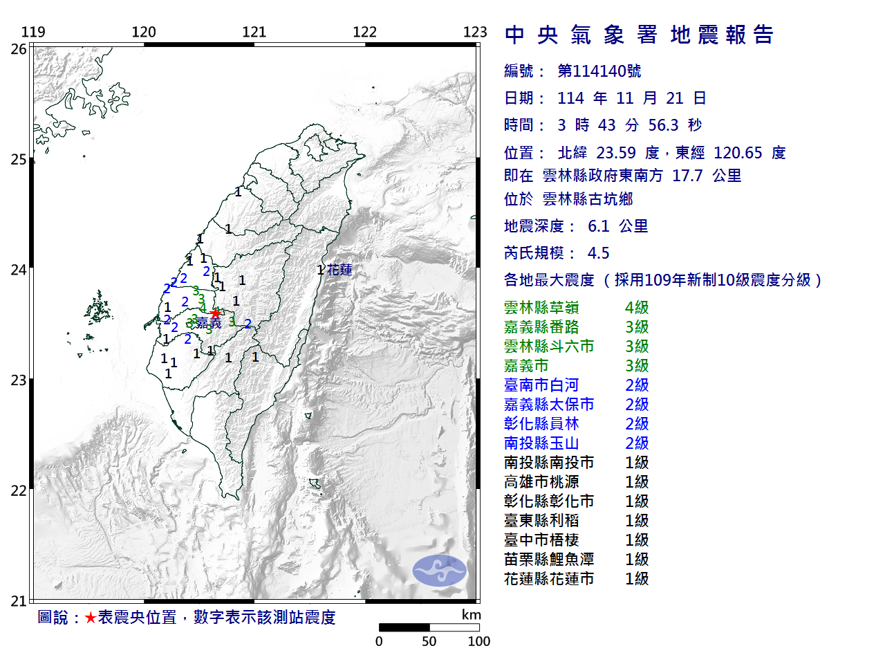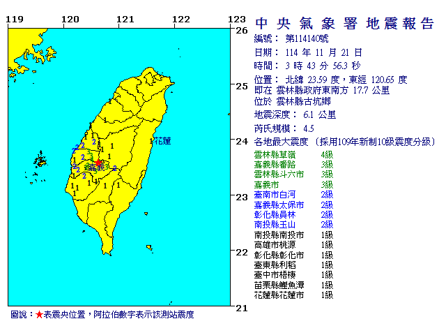| 雲林縣地區最大震度 4級 | 嘉義縣地區最大震度 3級 | 嘉義市地區最大震度 3級 |