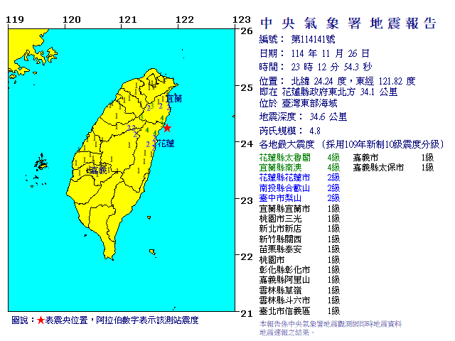 | 發 震 時 間: | 114年11月26日23時12分54.3秒 |