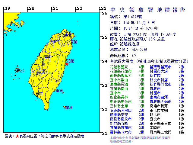 | 發 震 時 間: | 114年12月 8日19時24分57.0秒 |