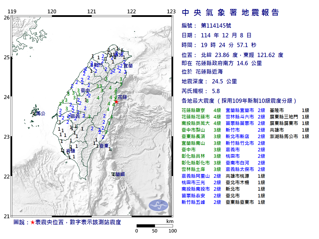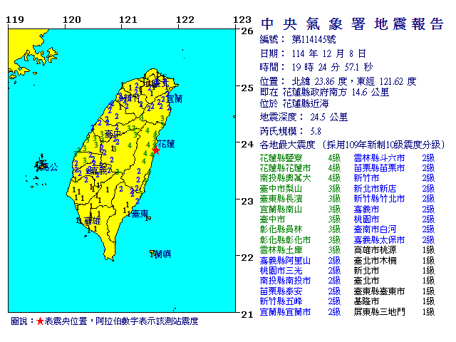 | 發 震 時 間: | 114年12月 8日19時24分57.1秒 |