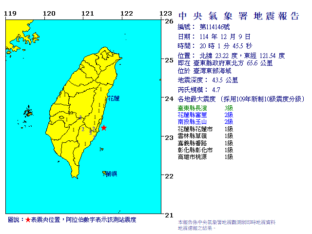 | 發 震 時 間: | 114年12月 9日20時 1分45.5秒 |