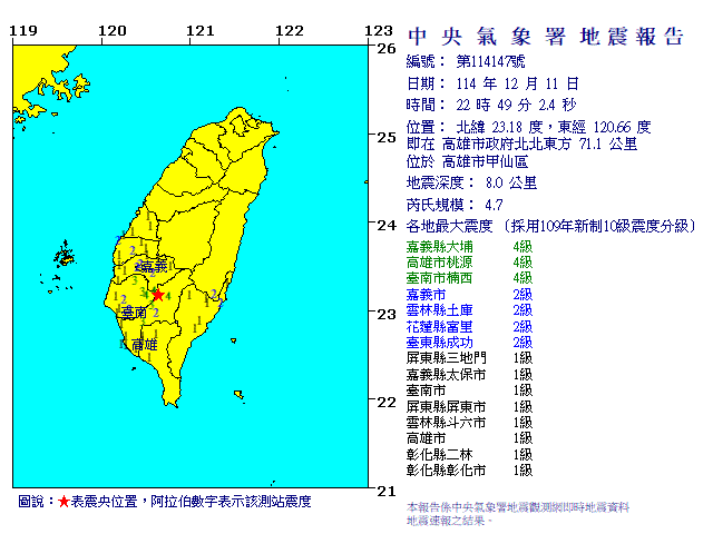 | 發 震 時 間: | 114年12月11日22時49分 2.4秒 |