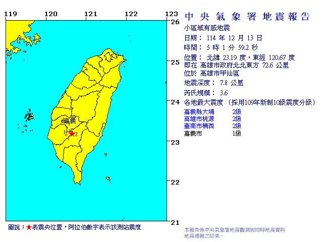| 發 震 時 間: | 114年12月13日 5時 1分59.2秒 |