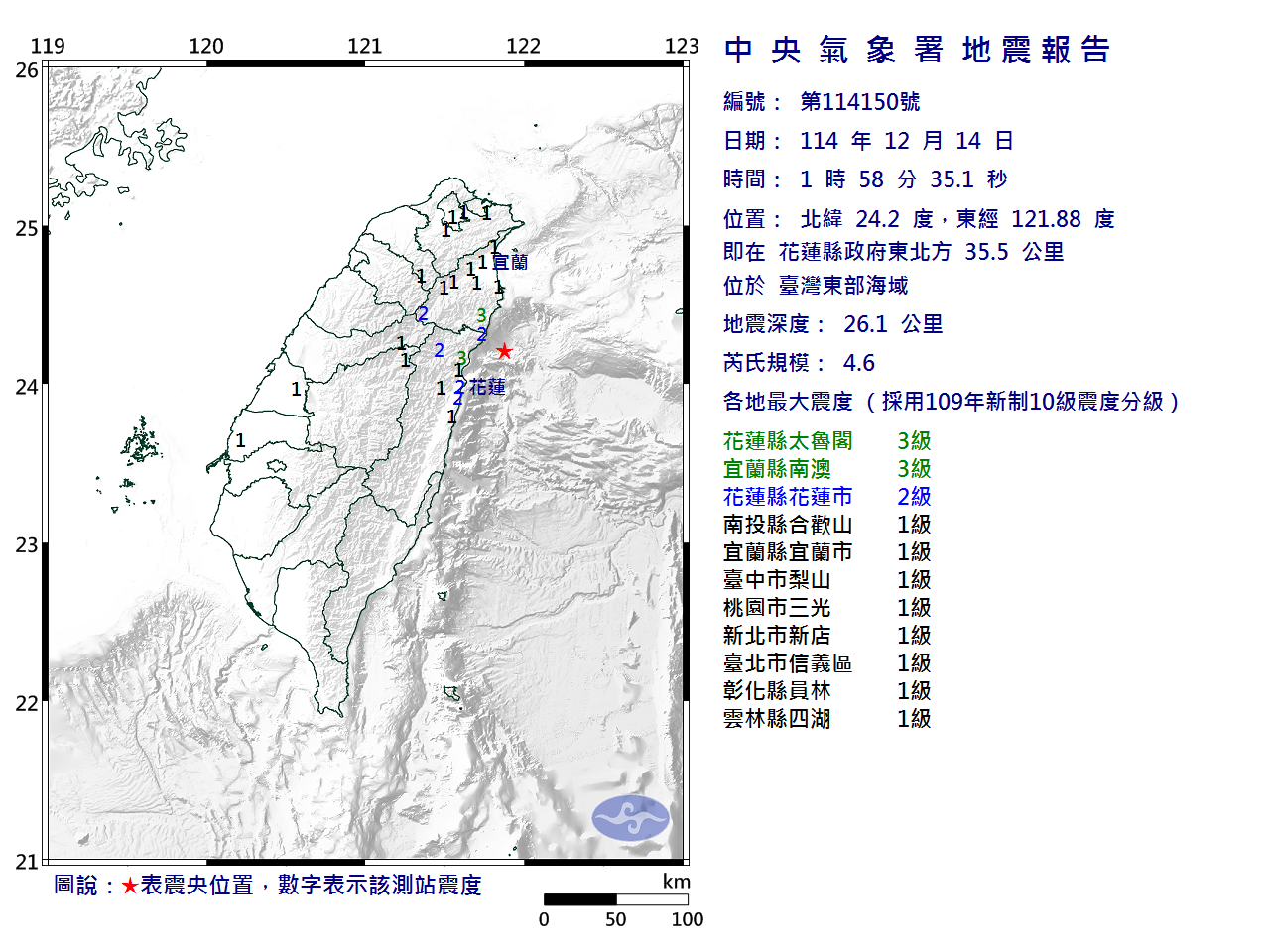 | 發 震 時 間: | 114年12月14日 1時58分35.1秒 |