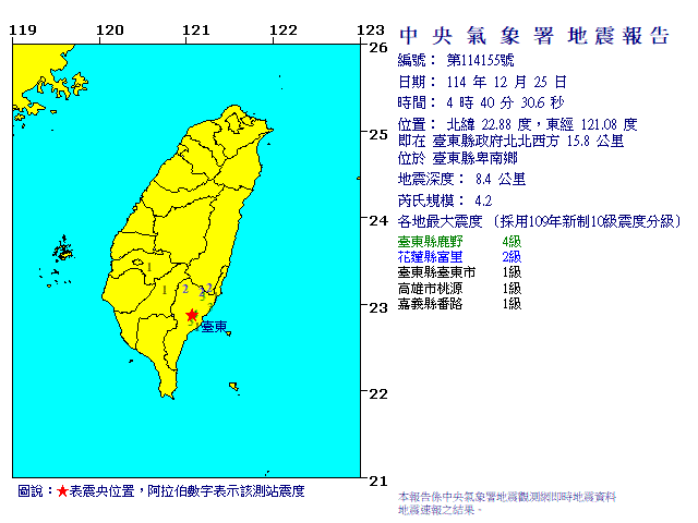 | 發 震 時 間: | 114年12月25日 4時40分30.6秒 |