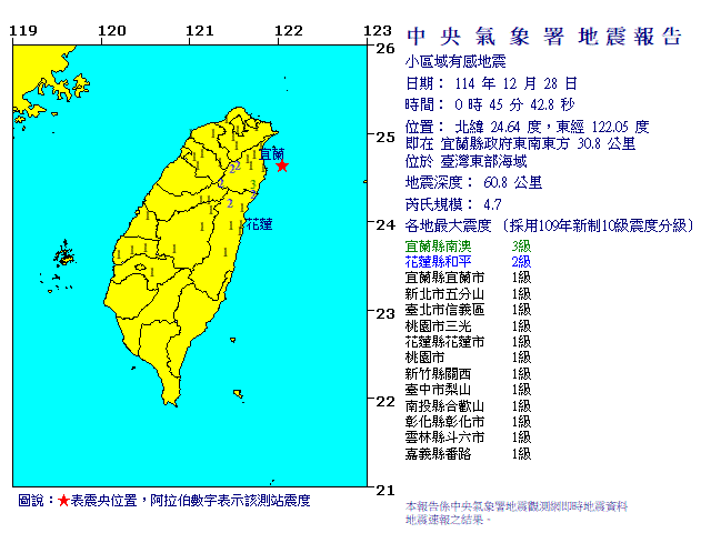 | 發 震 時 間: | 114年12月28日 0時45分42.8秒 |