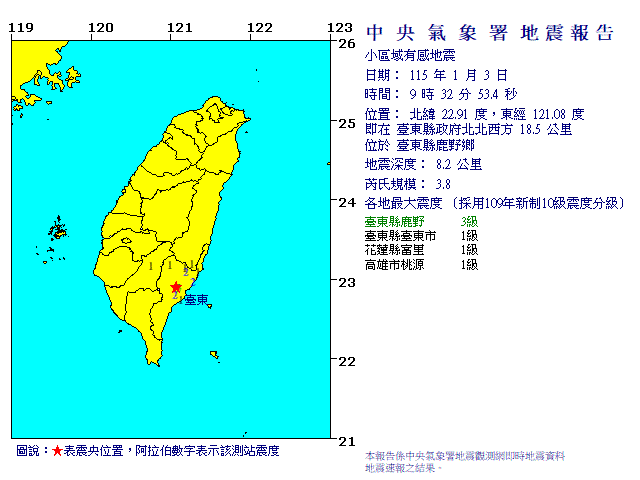 | 發 震 時 間: | 115年 1月 3日 9時32分53.4秒 |