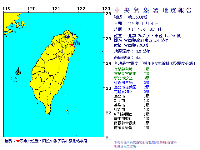 | 發 震 時 間: | 115年 1月 4日 3時52分50.1秒 |