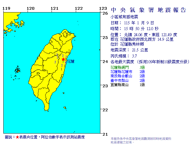 | 發 震 時 間: | 115年 1月 9日15時50分12.0秒 |