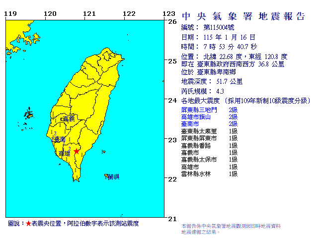 | 發 震 時 間: | 115年 1月16日 7時53分40.7秒 |