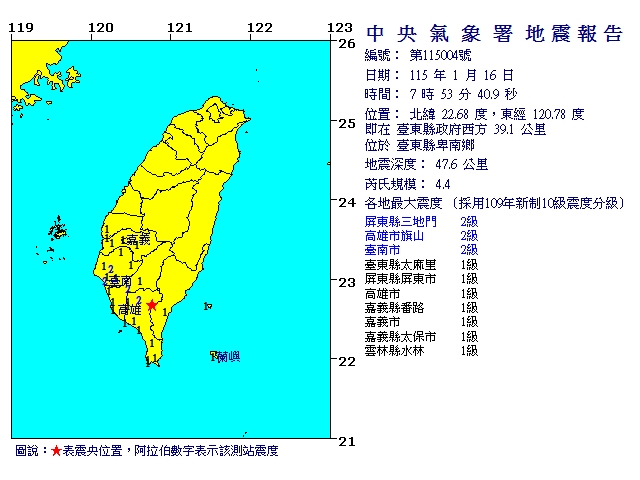 | 發 震 時 間: | 115年 1月16日 7時53分40.9秒 |