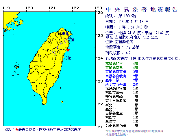| 發 震 時 間: | 115年 1月18日 1時 1分30.3秒 |
