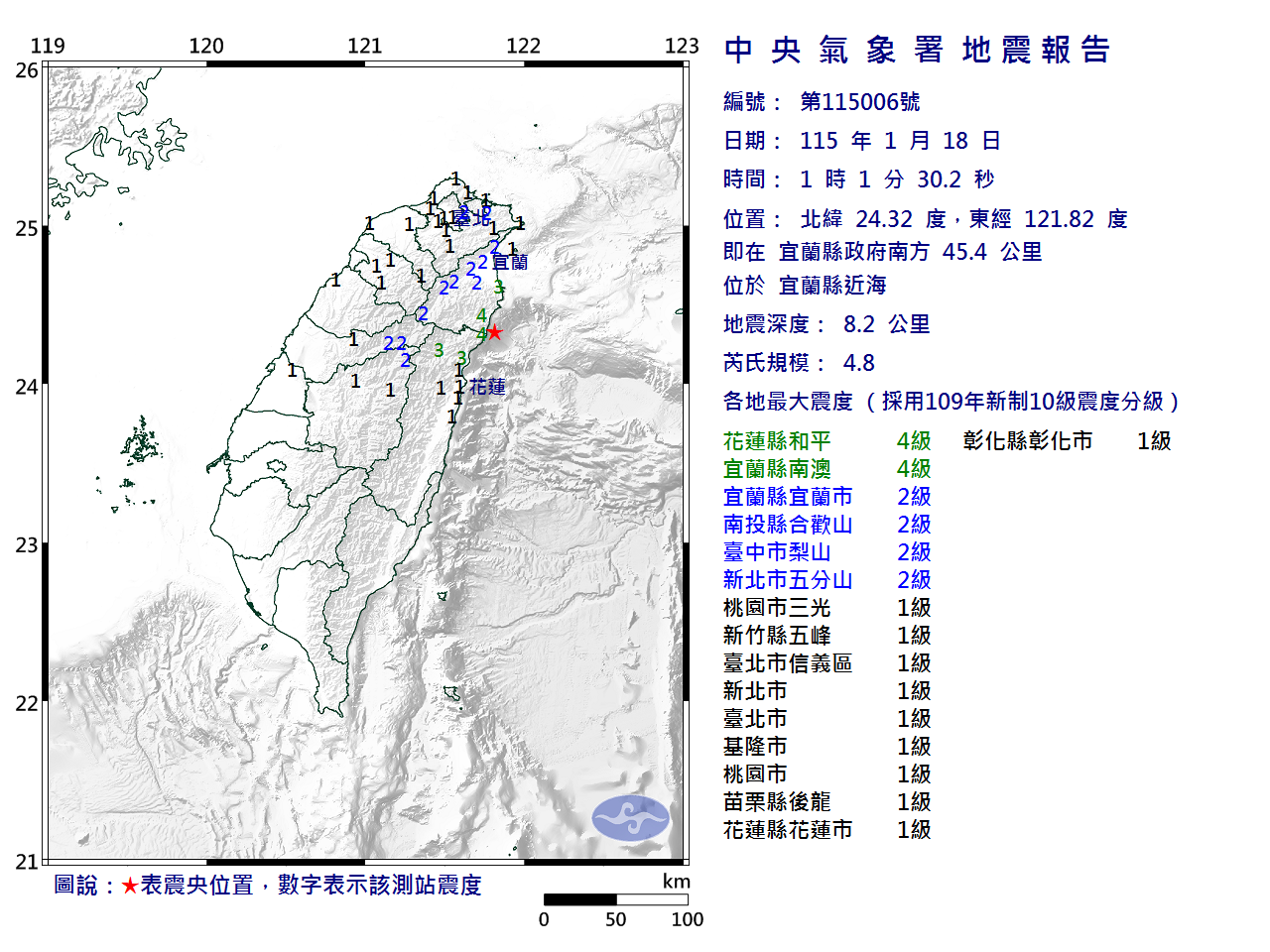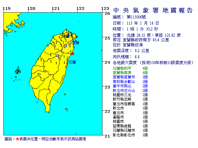 | 發 震 時 間: | 115年 1月18日 1時 1分30.2秒 |