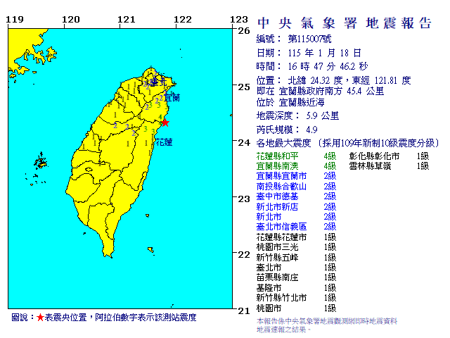 | 發 震 時 間: | 115年 1月18日16時47分46.2秒 |