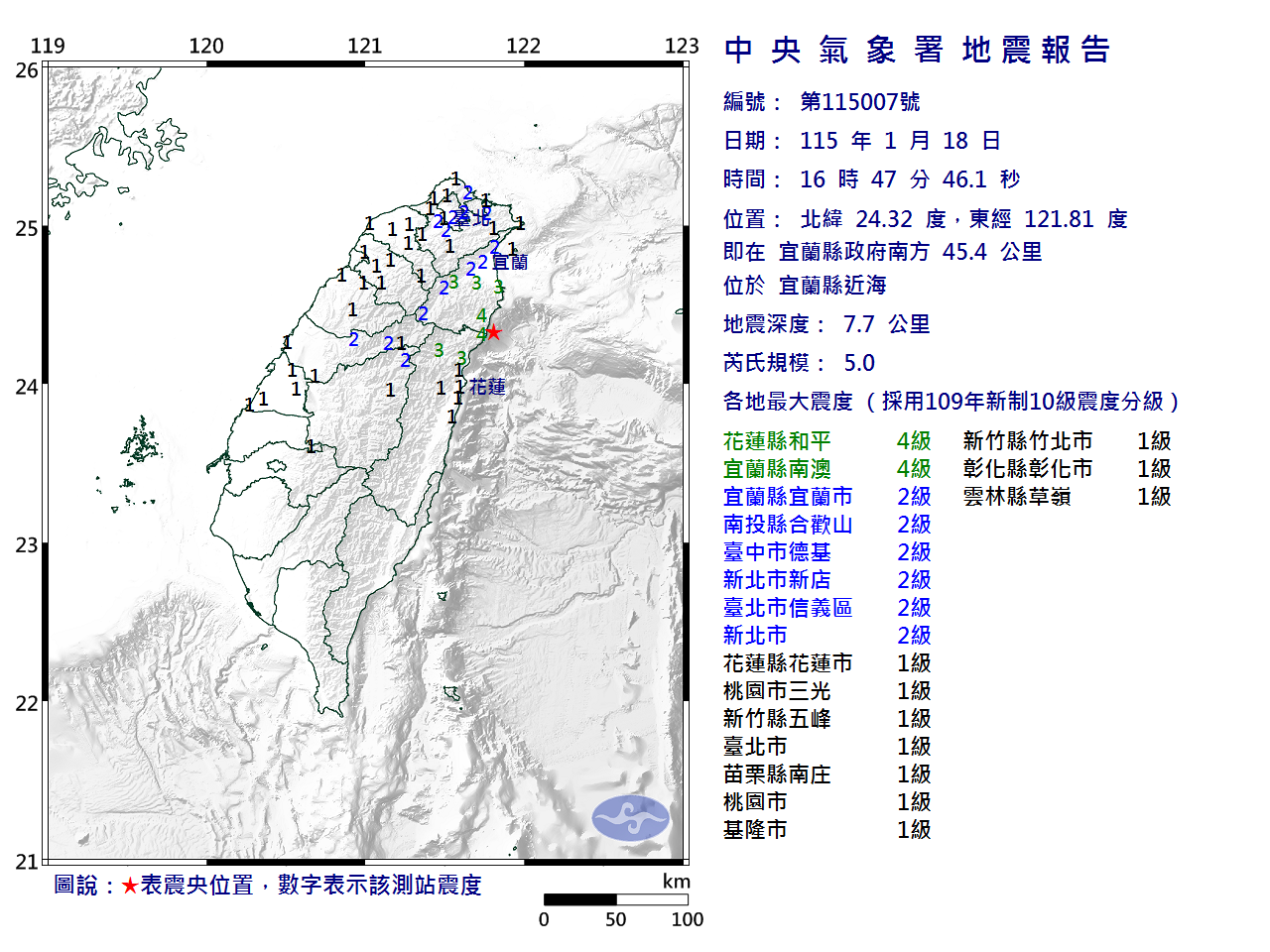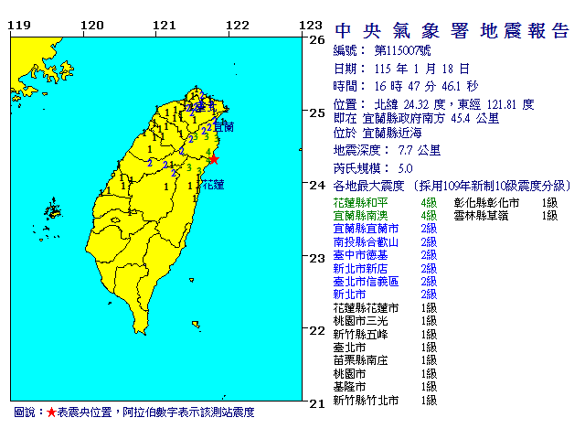 | 發 震 時 間: | 115年 1月18日16時47分46.1秒 |