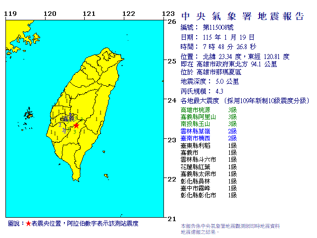 | 發 震 時 間: | 115年 1月19日 7時48分26.8秒 |
