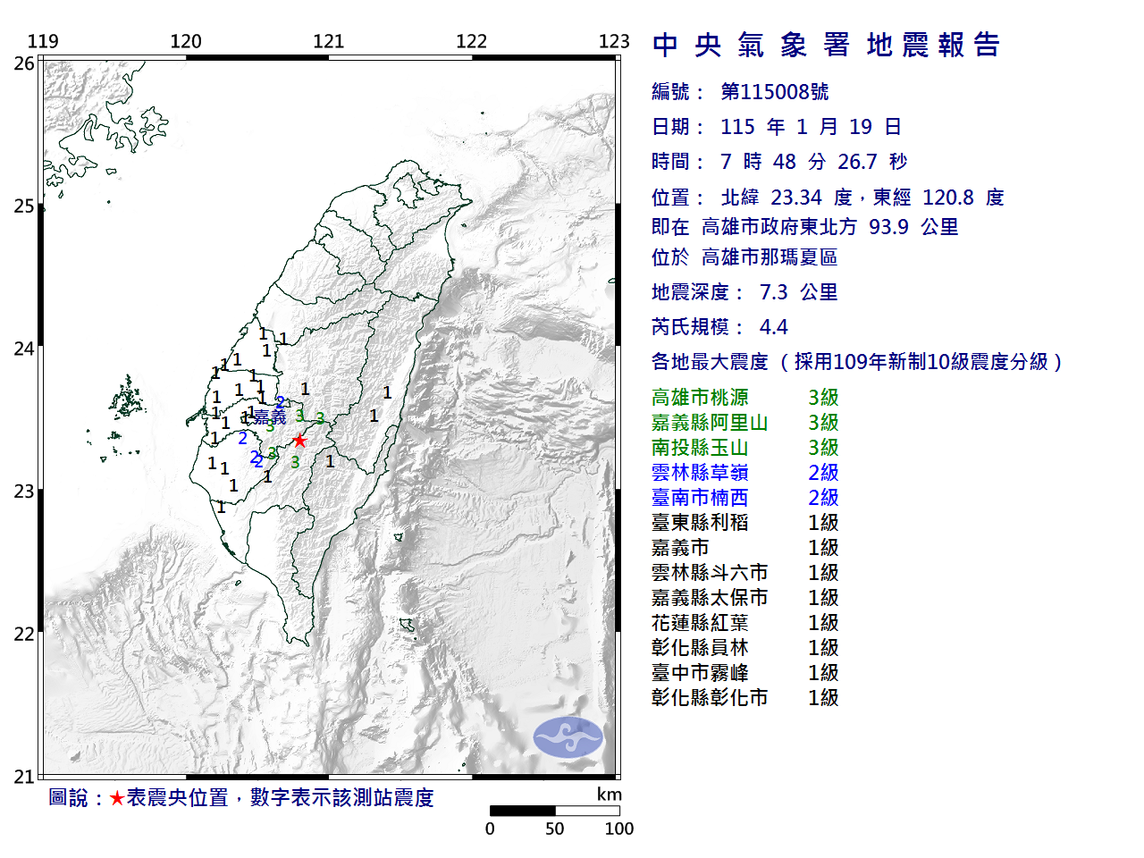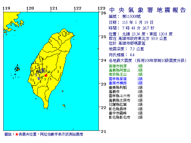 | 發 震 時 間: | 115年 1月19日 7時48分26.7秒 |