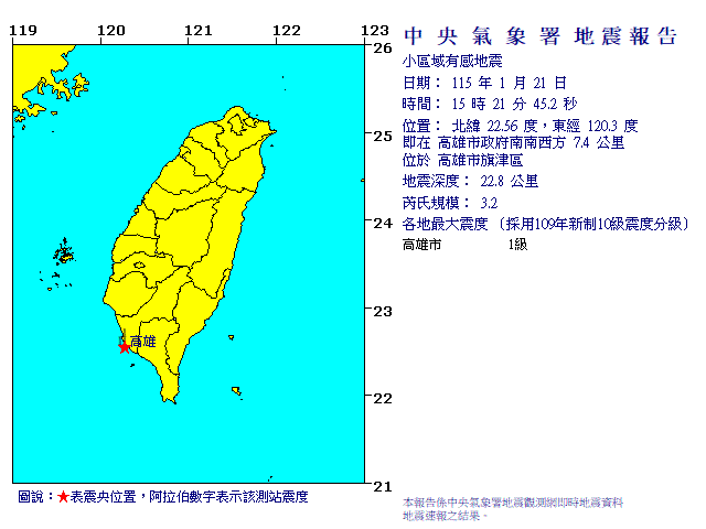 1月21日15時21分 規模 3.2 高雄市政府南南西方 7.4 公里 (位於高雄市旗津區)