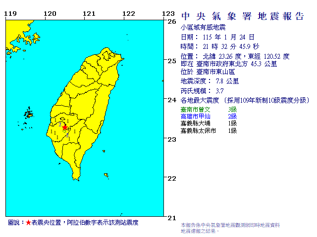 | 發 震 時 間: | 115年 1月24日21時32分45.9秒 |