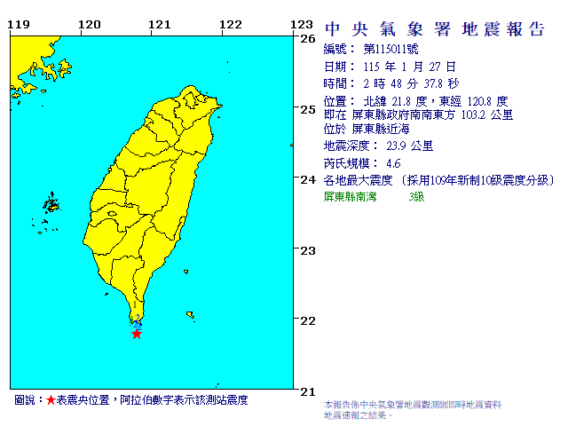 第011號 1月27日2時48分 規模 4.6 屏東縣政府南南東方 103.2 公里 (位於屏東縣近海)