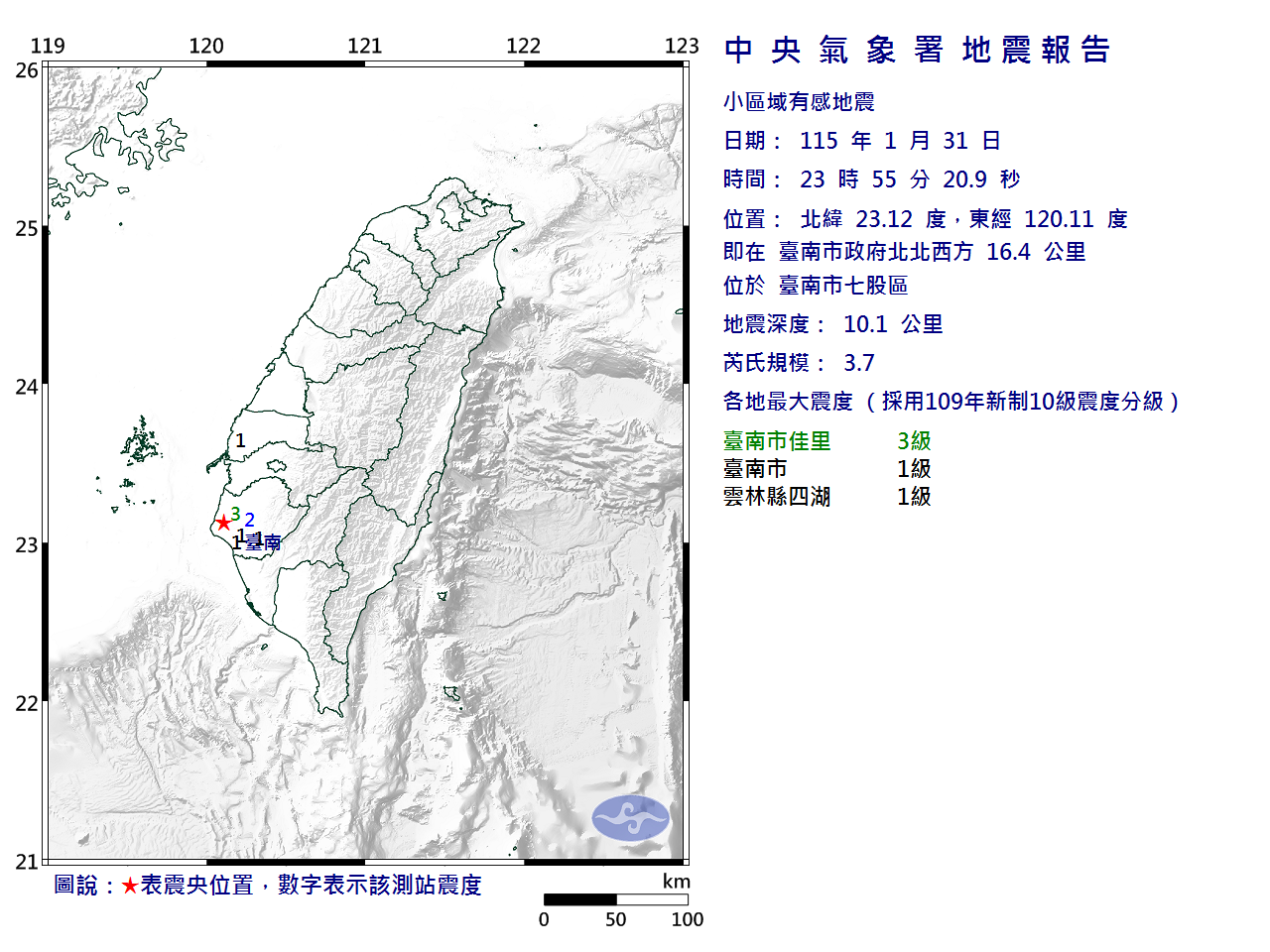 | 臺南市地區最大震度 3級 | 雲林縣地區最大震度 1級 |