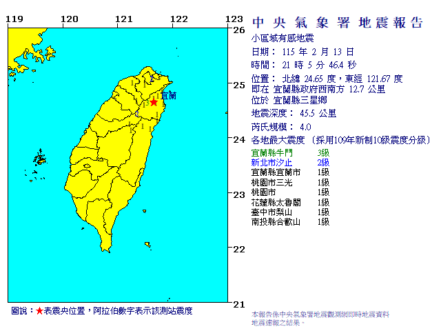 | 發 震 時 間: | 115年 2月13日21時 5分46.4秒 |