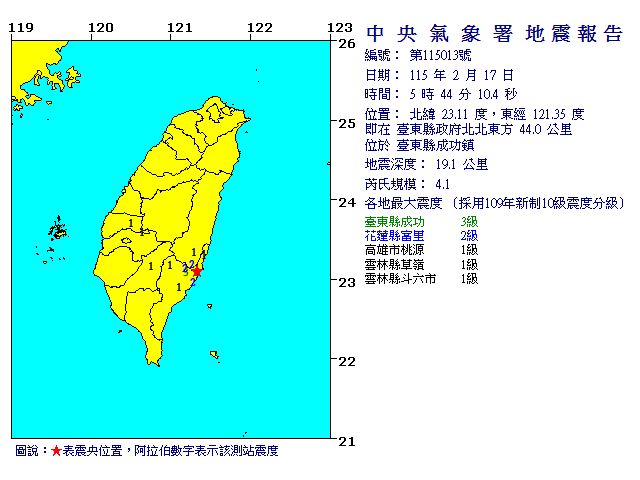 | 發 震 時 間: | 115年 2月17日 5時44分10.4秒 |