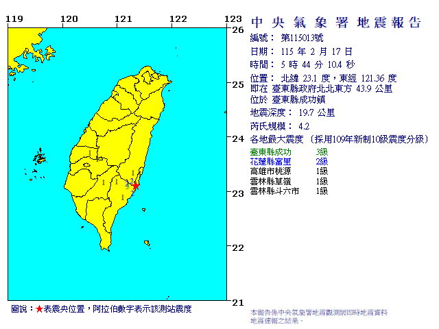 | 發 震 時 間: | 115年 2月17日 5時44分10.4秒 |