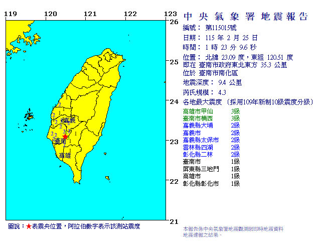 | 發 震 時 間: | 115年 2月25日 1時23分 9.6秒 |