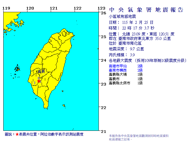 | 發 震 時 間: | 115年 2月25日22時17分 3.7秒 |