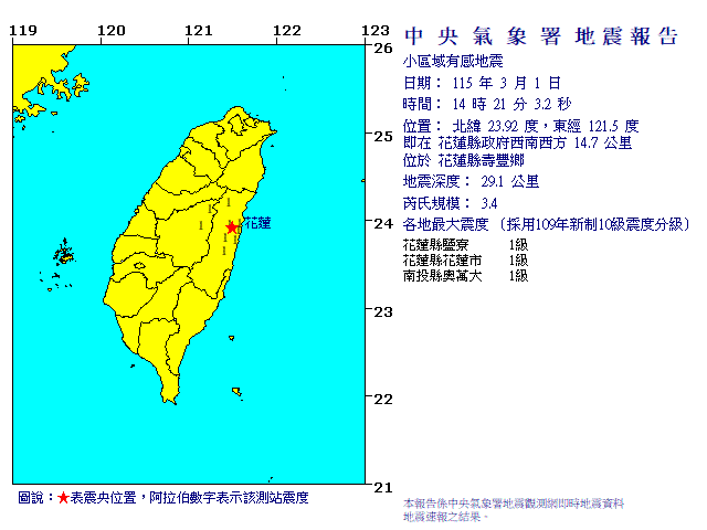 | 發 震 時 間: | 115年 3月 1日14時21分 3.2秒 |