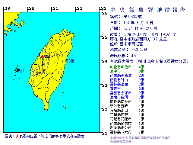 | 中央氣象署地震測報中心 第020號有感地震報告 |