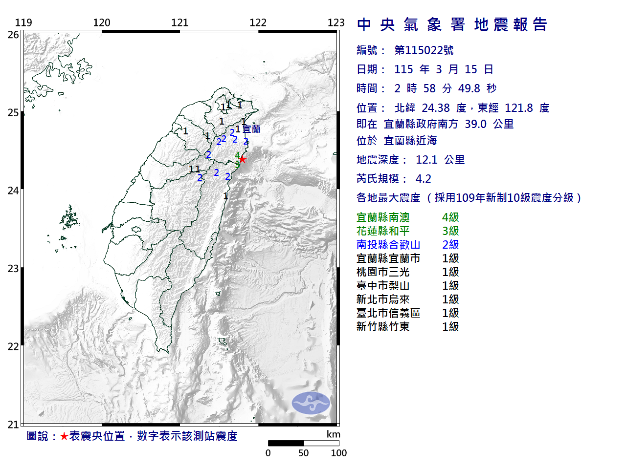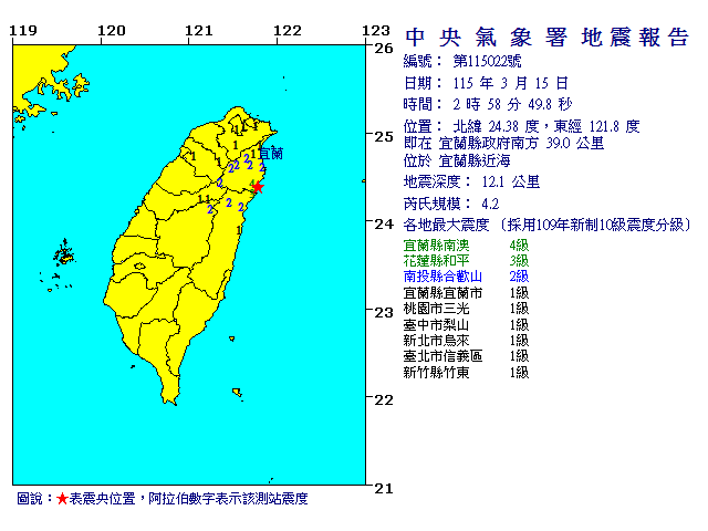 | 發 震 時 間: | 115年 3月15日 2時58分49.8秒 |