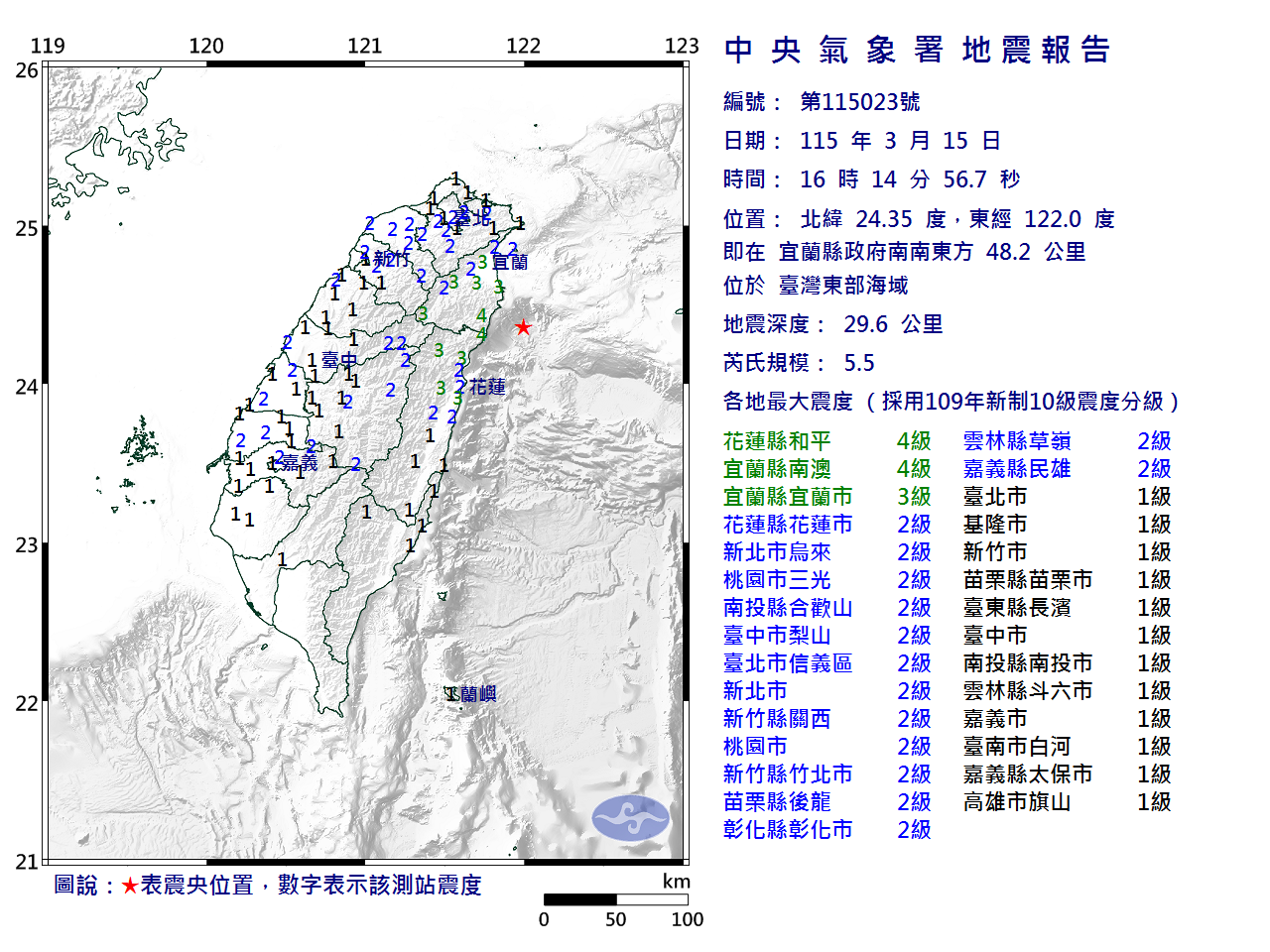 | 花蓮縣地區最大震度 4級 | 宜蘭縣地區最大震度 4級 | 新北市地區最大震度 2級 |