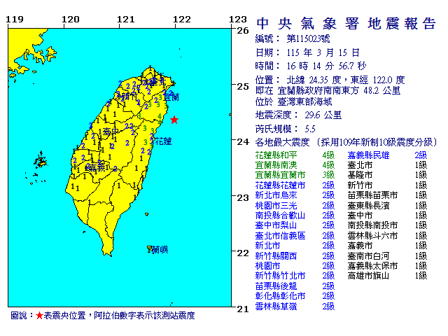 | 發 震 時 間: | 115年 3月15日16時14分56.7秒 |