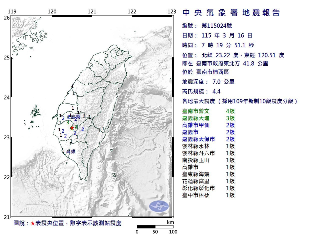 | 臺南市地區最大震度 4級 | 嘉義縣地區最大震度 3級 | 高雄市地區最大震度 2級 |
