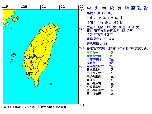 | 發 震 時 間: | 115年 3月16日 7時19分51.1秒 |
