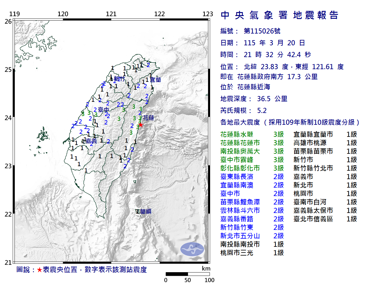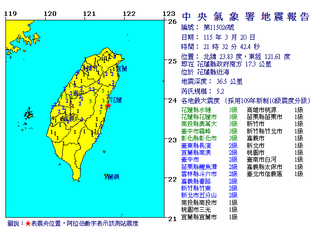 | 發 震 時 間: | 115年 3月20日21時32分42.4秒 |