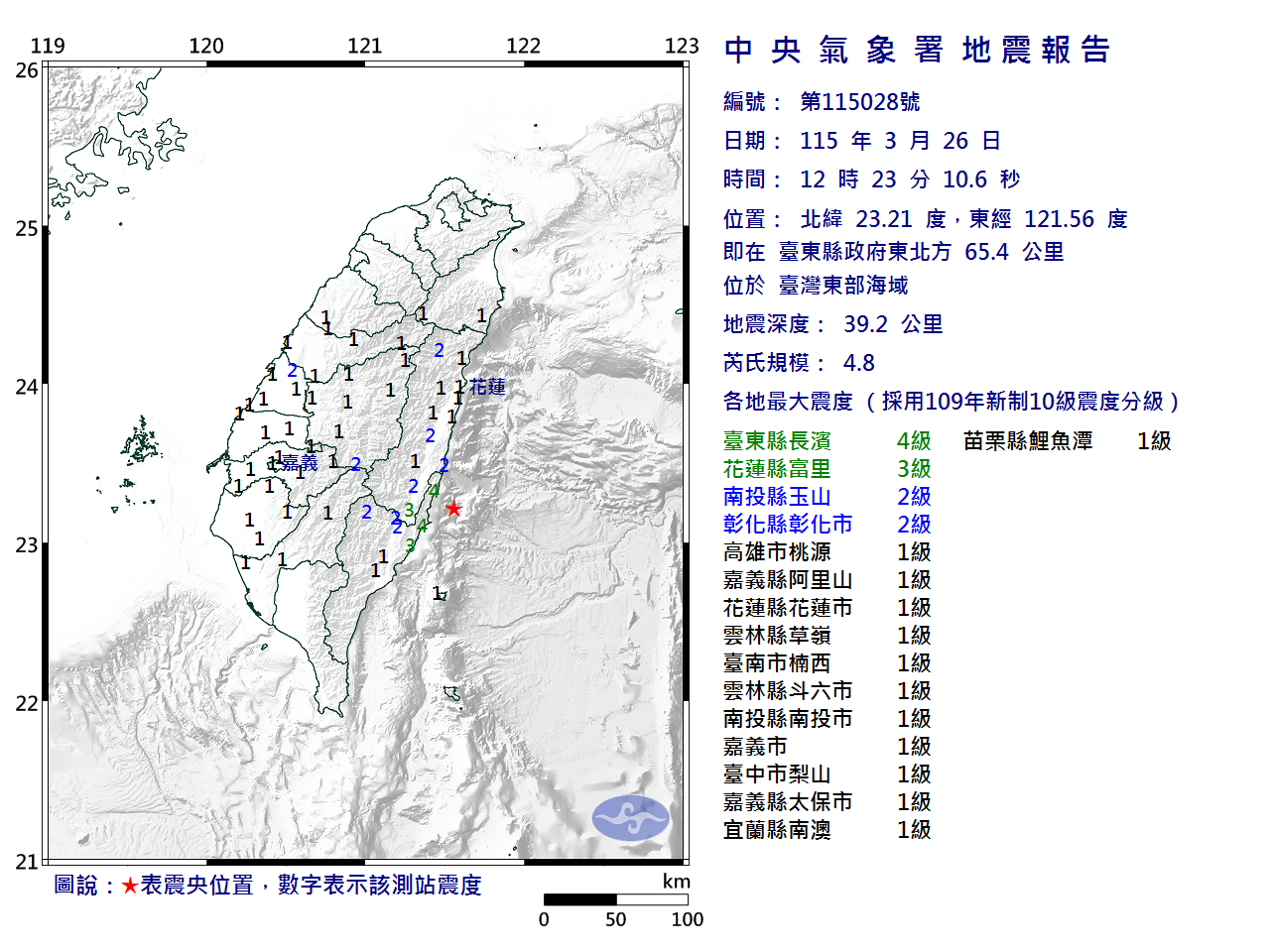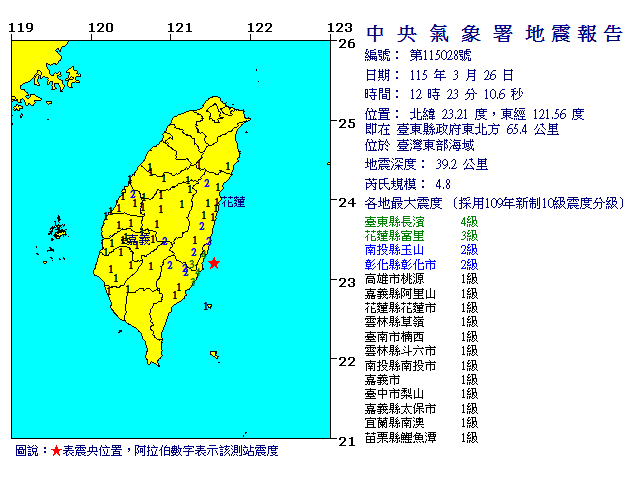 | 發 震 時 間: | 115年 3月26日12時23分10.6秒 |