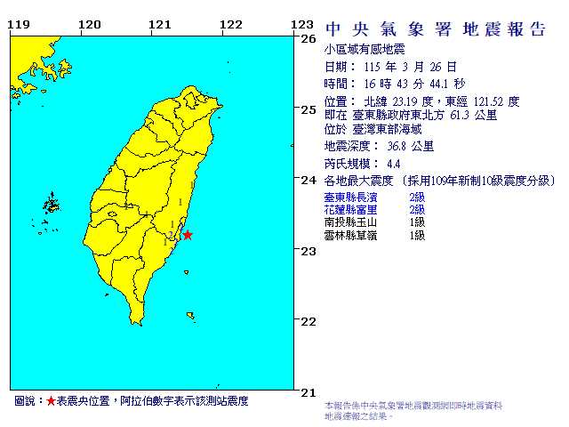 | 發 震 時 間: | 115年 3月26日16時43分44.1秒 |